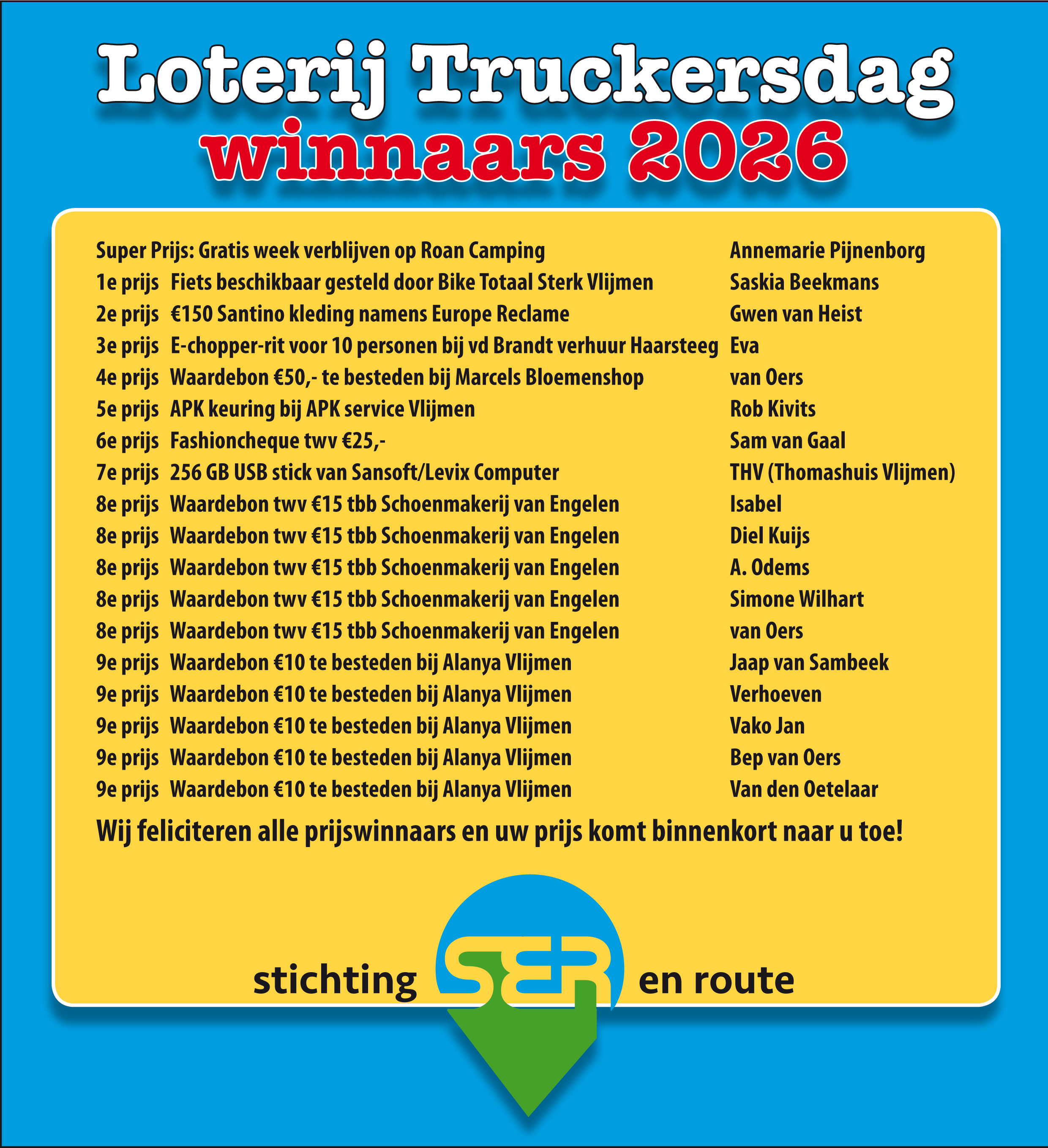 De stichting En Route organiseert ieder jaar vanuit Vlijmen een truckersdag waar mensen met een verstandelijke en/of lichamelijke beperking uit de gemeente Heusden de VIPS zijn en als zodanig mee toeren in het konvooi van 100 trucks. Dit kunnen wij mede mogelijk maken door onze sponsors die wij graag willen bedanken!